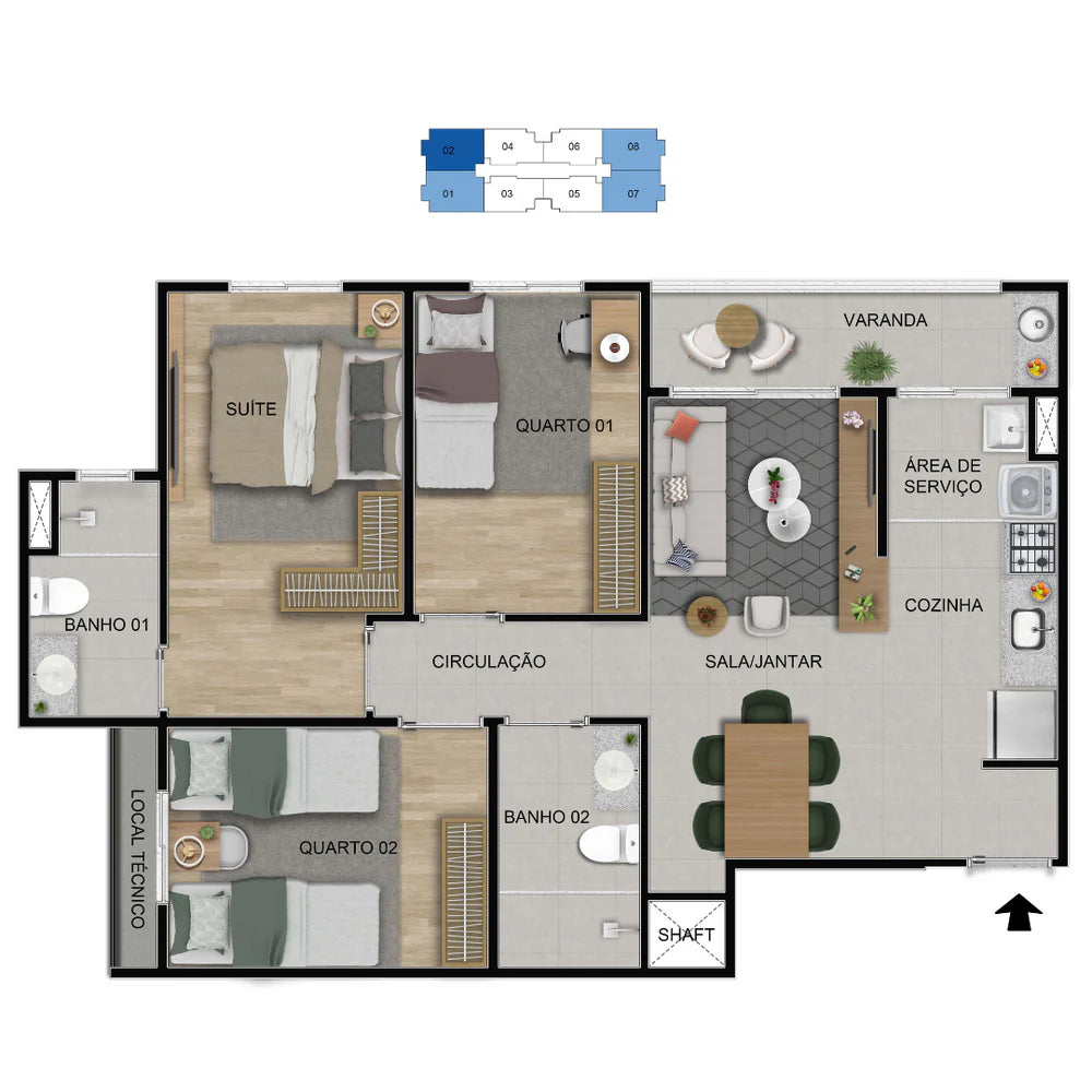 Temos opções de apartamentos que variam do térreo, com área privativa, até o 11° andar — coberturas.