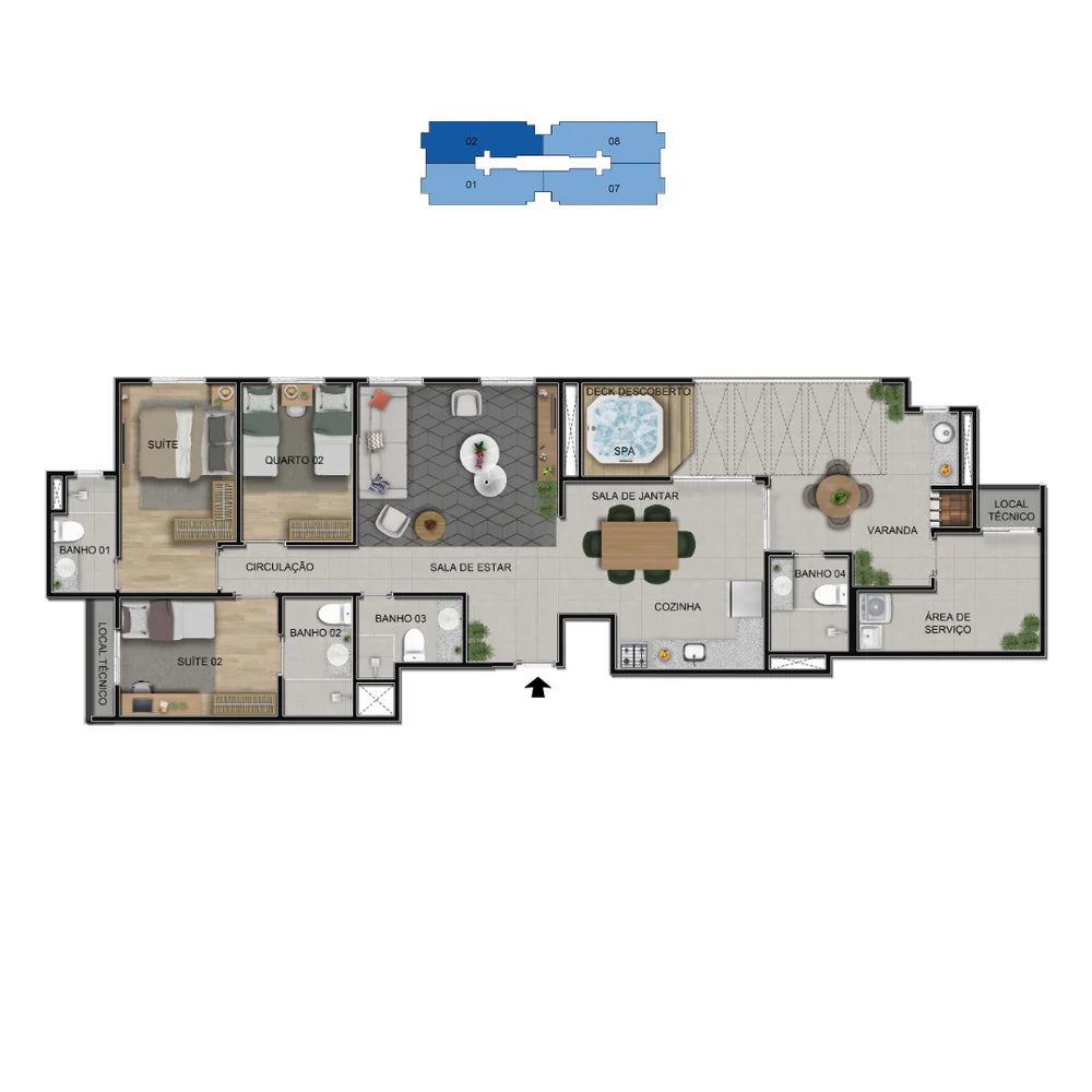 Cobertura 03Q. sendo duas suítes, área de serviço, churrasqueira à carvão, e varanda com jacuzzi.